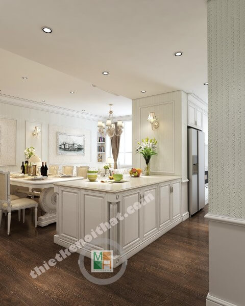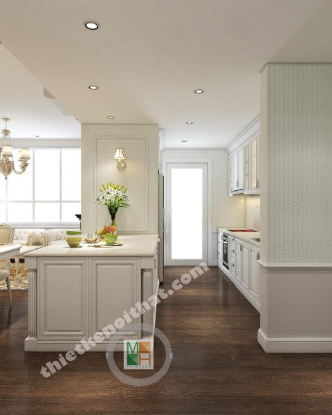 Sử dụng đá nhân tạo cao cấp MoreStone trong các hạng mục: ốp bàn đảo bếp, mặt bàn bếp, ốp tường