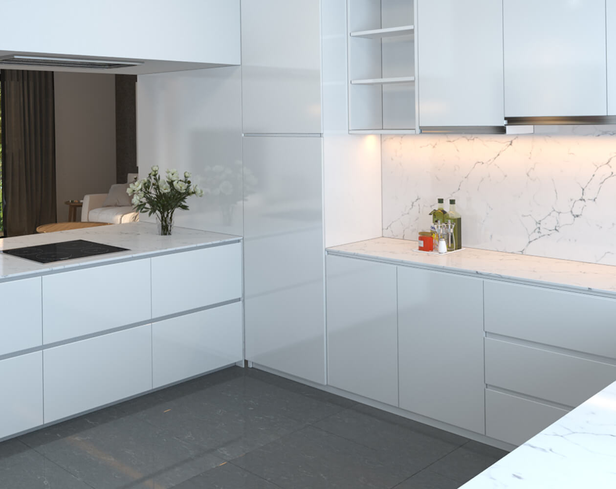 Đá nhân tạo vân xám ứng dụng hạng mục thi công: Làm mặt bàn bếp, ốp bếp, ốp bàn lavabo...