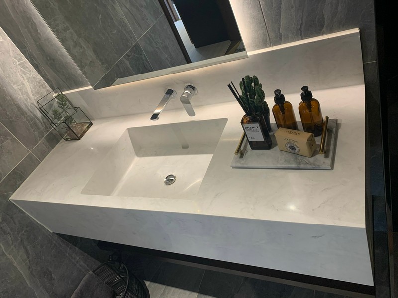 Đặc biệt, đá solid surface có thể làm chậu đá liền khối mang lại vẻ đẹp đồng bồ, hiện đại.