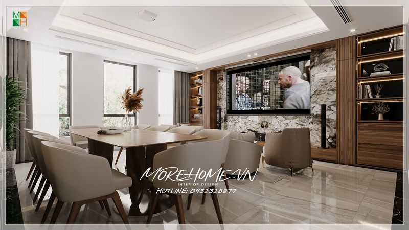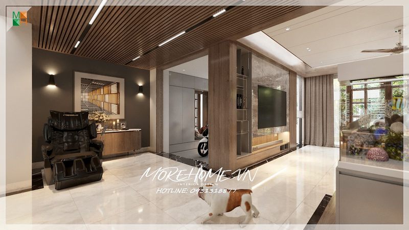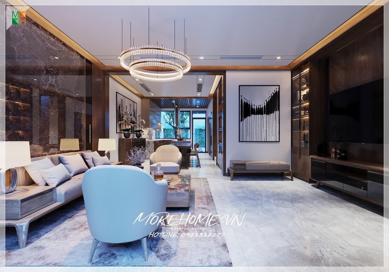 Tường phòng được sử dụng đá ốp tường vân mây tối màu giúp căn phòng khách của biệt thự có điểm nhấn trông rất đẹp mắt mà không kém sang trọng hiện đại trong đó.