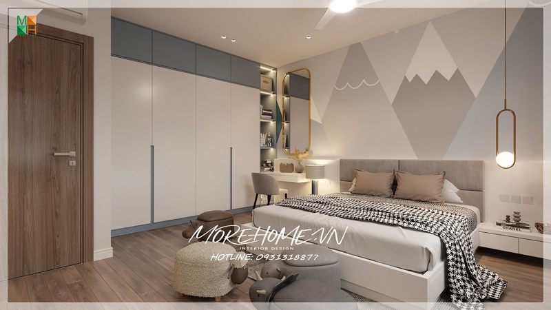 Morehome đề xuất một số mẫu thiết kế phòng ngủ kết hợp tranh dán tường có màu xanh tối, giúp tối ưu diện tích và tạo nên không gian mở rộng rãi và hiện đại.