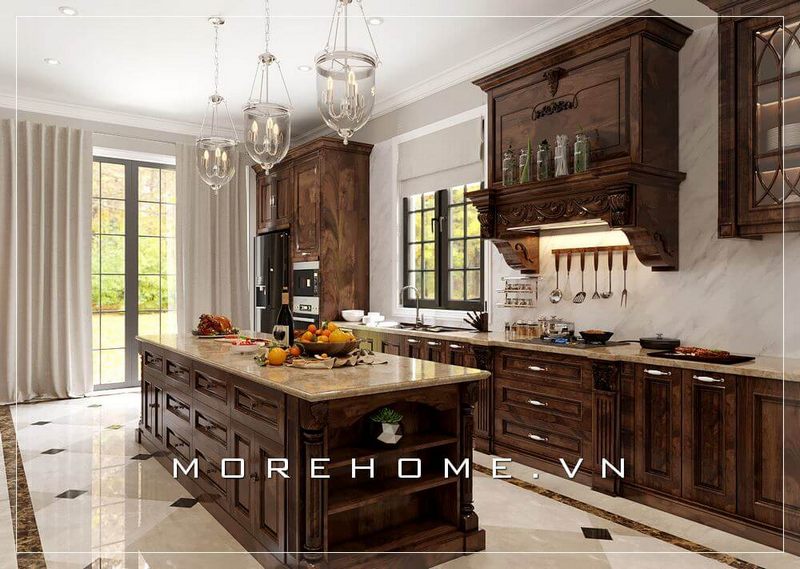 Phòng bếp biệt thự tân cổ điển được thiết kế sang trọng với nội thất gỗ tự nhiên có màu nâu ấm cúng và tinh tế.