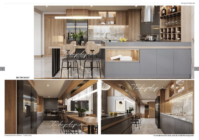 Mẫu tủ bếp theo phong cách tân cổ điển từ gỗ có chó có các nan chớp thông thoáng tiện lợi lưu trữ đồ đạc
