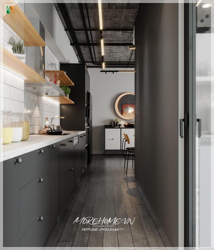 Một ý tưởng thú vị là sử dụng chiếu sáng từ phía trên xuống. Bạn có thể lắp đặt các bộ đèn treo hiện đại hoặc đèn led dưới kệ để chiếu sáng xuống các vùng như chảo, bàn ăn hay giữa kệ treo dao và kệ canh lạnh. Điều này không chỉ giúp bạn quan sát rõ ràng khi nấu nướng mà còn mang lại một hiệu ứng ấm áp và sang trọng cho căn bếp của bạn.
