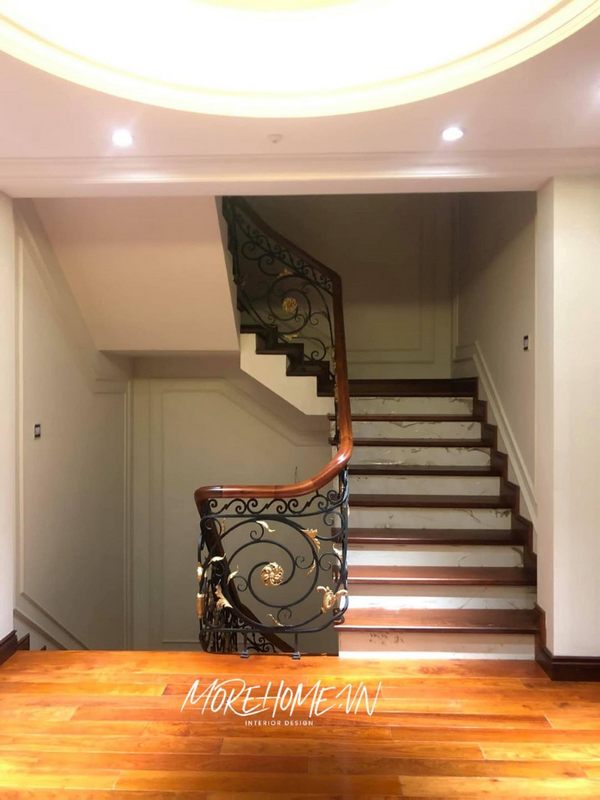 Sản phẩm cầu thang bằng gỗ tự nhiên được trang bị với khung sắt uốn nghệ thuật, sơn đen điểm chi tiết mạ vàng, tay vịn gỗ, cổ bậc ốp đá mang lại vẻ đẹp sang trọng cho các căn nhà phố, chung cư.