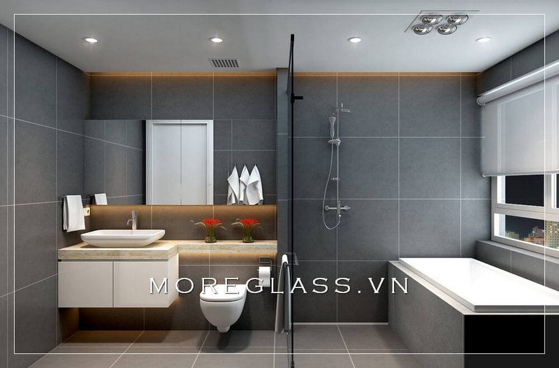 Mẫu thiết kế phòng tắm đơn giản nhưng tiện nghi, sử dụng vách ngăn kính cường lực để phân chia ra hai không gian phòng tắm và vực vệ sinh, được trang trí bằng nội thất đẹp mắt.