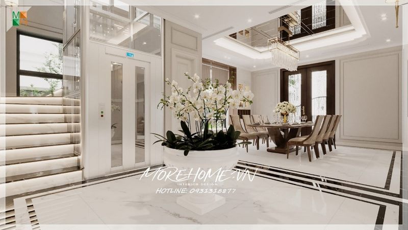 Cầu thang biệt thự sử dụng cổ bậc đá nhân tạo màu trắng sang trọng