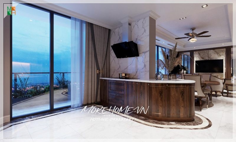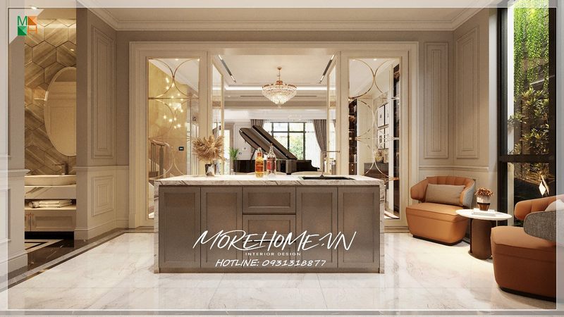 Biệt thự, nhà phố cần thiết kế một phòng bếp với một quầy bar đảo bếp ốp đá trắng có thể thay thế cho bàn ăn nhỏ dành cho số lượng người ít.