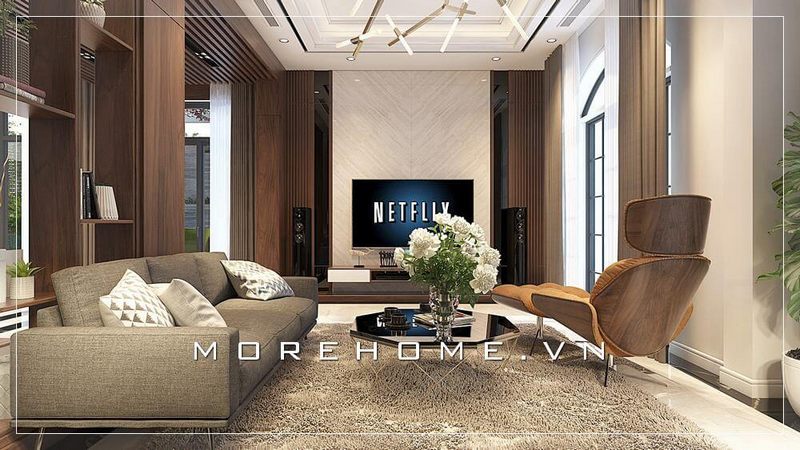 Sofa phòng khách biệt thự được thiết kế theo phong cách tân cổ điển với sự kết hợp giữa gỗ tự nhiên và nhịp nhàng, tạo nên hiệu ứng đẹp mắt.