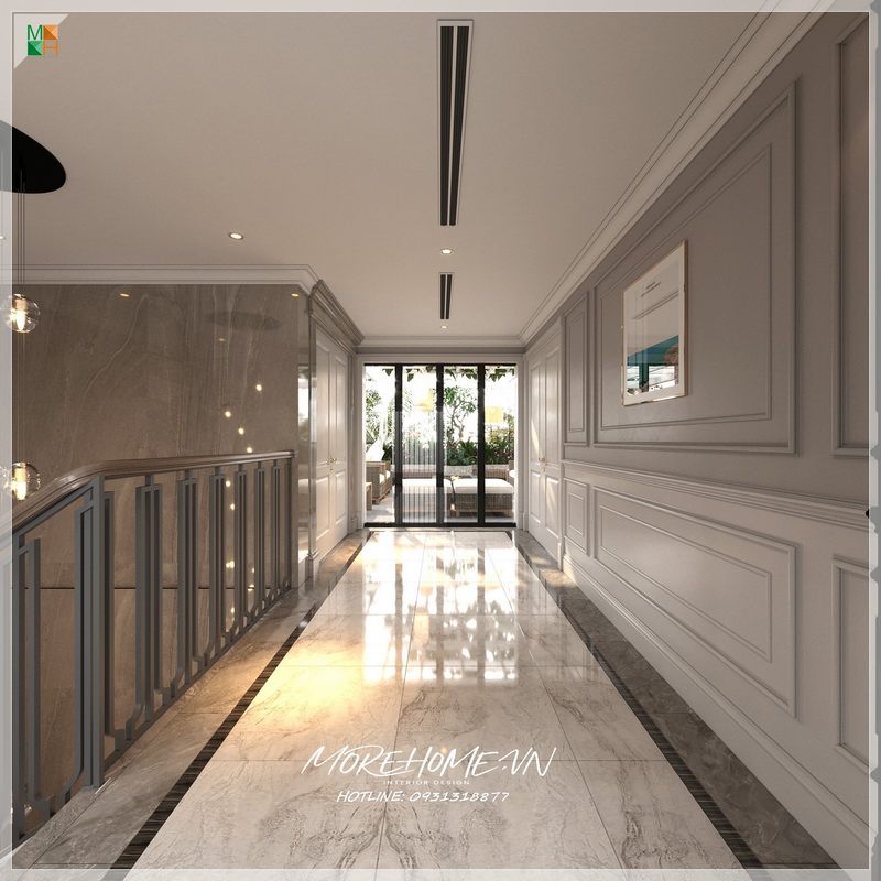 Không gian hành lang biệt thự nhà phố được tạo nên với sự kết hợp tinh tế và hiện đại của sàn đá vân mây, góp phần tạo nên một cảm giác thoáng đãng.