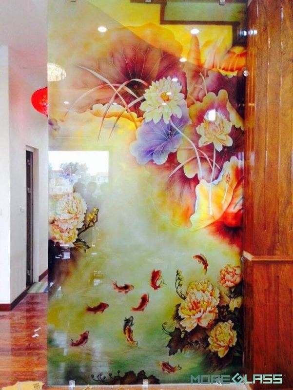 Mẫu vách kính khắc 3D có hình tranh cá chép, hoa sen và mẫu đơn, mang lại ý nghĩa phong thủy giúp tạo ra những điều may mắn, tốt lành, bình an cho gia chủ.