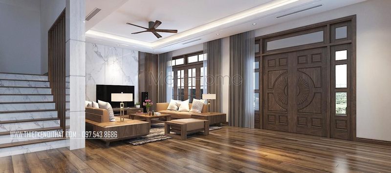 Mẫu cửa gỗ 2 cánh có thiết kế đẳng cấp, màu nâu đồng bộ tạo nên sự liền mạch trong không gian tiếp đón khách của gia chủ.