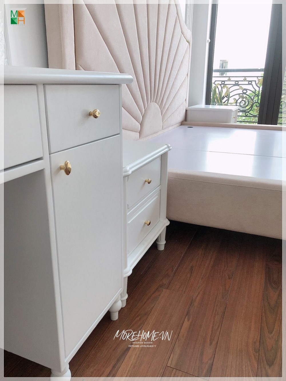 Morehome đã thực hiện hình ảnh công trình thi công giường ngủ gỗ tự nhiên tân cổ điển với phun sơn màu trắng đẹp.